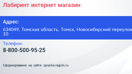 Лабиринт, интернет-магазин по адресу 634049, Томская область, Томск, Новосибирский переулок, 10 в дальнейшем Организация, размещена в следующих категориях:
