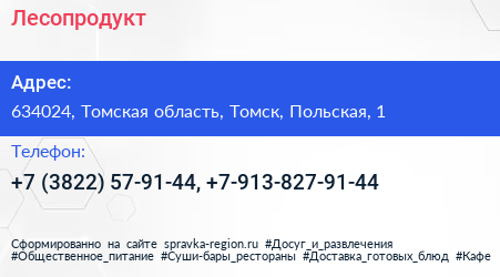 Лесопродукт по адресу 634024, Томская область, Томск, Польская, 1 в дальнейшем Организация, размещена в следующих категориях: