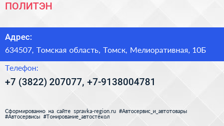 ПОЛИТЭН по адресу 634507, Томская область, Томск, Мелиоративная, 10Б в дальнейшем Организация, размещена в следующих категориях: