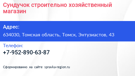 Сундучок, строительно-хозяйственный магазин по адресу 634030, Томская область, Томск, Энтузиастов, 43 в дальнейшем Организация, размещена в следующих категориях: