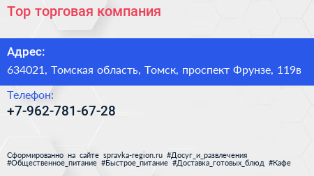 Тор, торговая компания по адресу 634021, Томская область, Томск, проспект Фрунзе, 119в в дальнейшем Организация, размещена в следующих категориях: