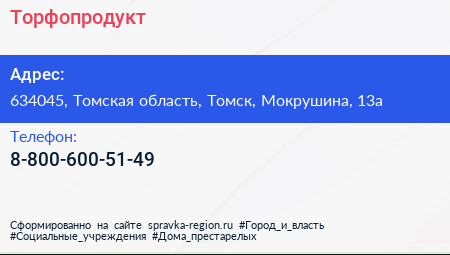 Торфопродукт по адресу 634045, Томская область, Томск, Мокрушина, 13а в дальнейшем Организация, размещена в следующих категориях: