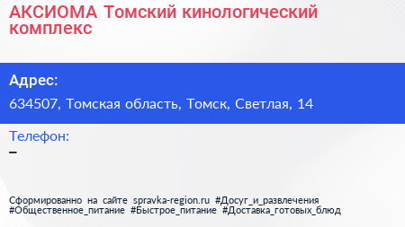 АКСИОМА, Томский кинологический комплекс по адресу 634507, Томская область, Томск, Светлая, 14 в дальнейшем Организация, размещена в следующих категориях: