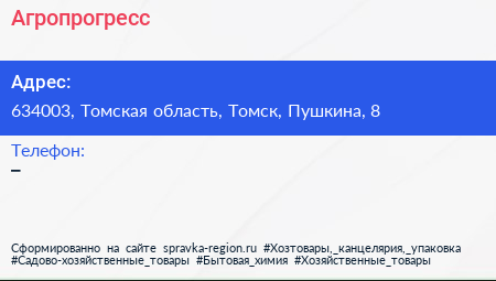 Агропрогресс по адресу 634003, Томская область, Томск, Пушкина, 8 в дальнейшем Организация, размещена в следующих категориях: