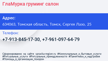 ГлаМурка, груминг-салон по адресу 634063, Томская область, Томск, Сергея Лазо, 25 в дальнейшем Организация, размещена в следующих категориях: