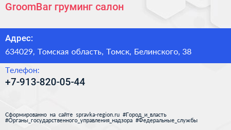 GroomBar, груминг-салон по адресу 634029, Томская область, Томск, Белинского, 38 в дальнейшем Организация, размещена в следующих категориях: