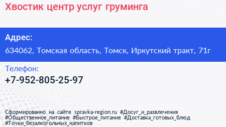 Хвостик, центр услуг груминга по адресу 634062, Томская область, Томск, Иркутский тракт, 71г в дальнейшем Организация, размещена в следующих категориях: