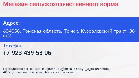 Магазин сельскохозяйственного корма по адресу 634058, Томская область, Томск, Кузовлевский тракт, 38 ст2 в дальнейшем Организация, размещена в следующих категориях: