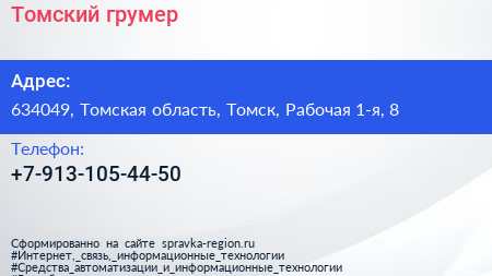 Томский грумер по адресу 634049, Томская область, Томск, Рабочая 1-я, 8 в дальнейшем Организация, размещена в следующих категориях: