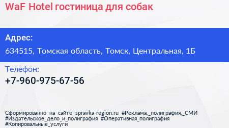 WaF Hotel, гостиница для собак по адресу 634515, Томская область, Томск, Центральная, 1Б в дальнейшем Организация, размещена в следующих категориях: