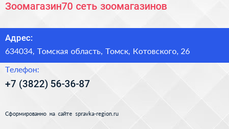 Зоомагазин70, сеть зоомагазинов по адресу 634034, Томская область, Томск, Котовского, 26 в дальнейшем Организация, размещена в следующих категориях: