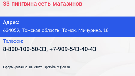 33 пингвина, сеть магазинов по адресу 634059, Томская область, Томск, Мичурина, 18 в дальнейшем Организация, размещена в следующих категориях: