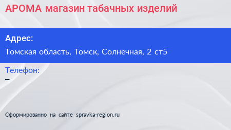 АРОМА, магазин табачных изделий по адресу Томская область, Томск, Солнечная, 2 ст5 в дальнейшем Организация, размещена в следующих категориях: