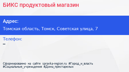 БИКС, продуктовый магазин по адресу Томская область, Томск, Советская улица, 7 в дальнейшем Организация, размещена в следующих категориях: