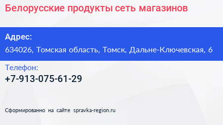 Белорусские продукты, сеть магазинов по адресу 634026, Томская область, Томск, Дальне-Ключевская, 6 в дальнейшем Организация, размещена в следующих категориях: