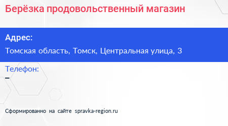 Берёзка, продовольственный магазин по адресу Томская область, Томск, Центральная улица, 3 в дальнейшем Организация, размещена в следующих категориях: