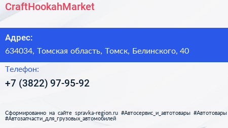 CraftHookahMarket по адресу 634034, Томская область, Томск, Белинского, 40 в дальнейшем Организация, размещена в следующих категориях: