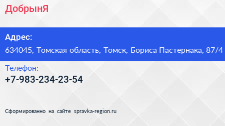 ДобрынЯ по адресу 634045, Томская область, Томск, Бориса Пастернака, 87/4 в дальнейшем Организация, размещена в следующих категориях: