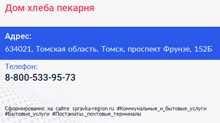 Дом хлеба, пекарня по адресу 634021, Томская область, Томск, проспект Фрунзе, 152Б в дальнейшем Организация, размещена в следующих категориях: