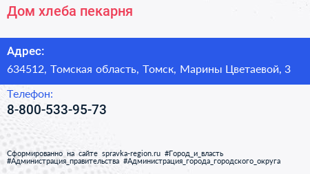 Дом хлеба, пекарня по адресу 634512, Томская область, Томск, Марины Цветаевой, 3 в дальнейшем Организация, размещена в следующих категориях: