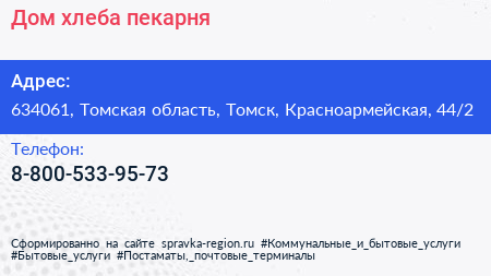 Дом хлеба, пекарня по адресу 634061, Томская область, Томск, Красноармейская, 44/2 в дальнейшем Организация, размещена в следующих категориях: