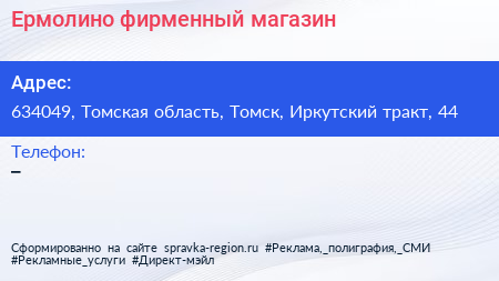 Ермолино, фирменный магазин по адресу 634049, Томская область, Томск, Иркутский тракт, 44 в дальнейшем Организация, размещена в следующих категориях: