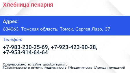 Хлебница, пекарня по адресу 634063, Томская область, Томск, Сергея Лазо, 37 в дальнейшем Организация, размещена в следующих категориях: