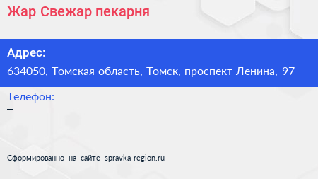 Жар Свежар, пекарня по адресу 634050, Томская область, Томск, проспект Ленина, 97 в дальнейшем Организация, размещена в следующих категориях: