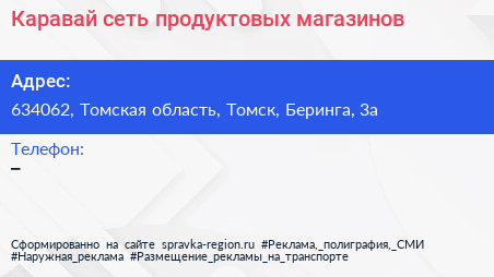 Каравай, сеть продуктовых магазинов по адресу 634062, Томская область, Томск, Беринга, 3а в дальнейшем Организация, размещена в следующих категориях: