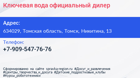 Ключевая вода, официальный дилер по адресу 634029, Томская область, Томск, Никитина, 13 в дальнейшем Организация, размещена в следующих категориях: