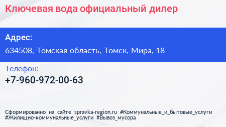 Ключевая вода, официальный дилер по адресу 634508, Томская область, Томск, Мира, 18 в дальнейшем Организация, размещена в следующих категориях: