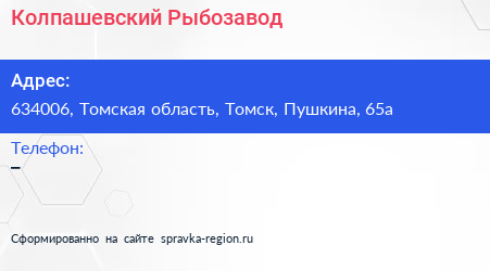 Колпашевский Рыбозавод по адресу 634006, Томская область, Томск, Пушкина, 65а в дальнейшем Организация, размещена в следующих категориях:
