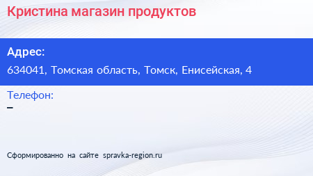 Кристина, магазин продуктов по адресу 634041, Томская область, Томск, Енисейская, 4 в дальнейшем Организация, размещена в следующих категориях: