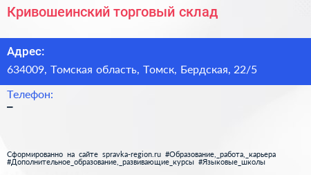 Кривошеинский, торговый склад по адресу 634009, Томская область, Томск, Бердская, 22/5 в дальнейшем Организация, размещена в следующих категориях: