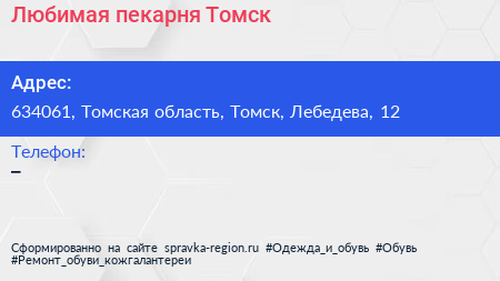 Любимая пекарня Томск по адресу 634061, Томская область, Томск, Лебедева, 12 в дальнейшем Организация, размещена в следующих категориях: