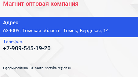 Магнит, оптовая компания по адресу 634009, Томская область, Томск, Бердская, 14 в дальнейшем Организация, размещена в следующих категориях: