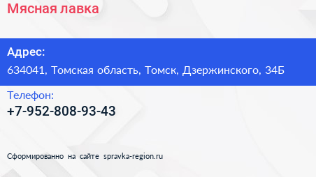 Мясная лавка по адресу 634041, Томская область, Томск, Дзержинского, 34Б в дальнейшем Организация, размещена в следующих категориях: