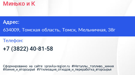 Минько и К по адресу 634009, Томская область, Томск, Мельничная, 38г в дальнейшем Организация, размещена в следующих категориях: