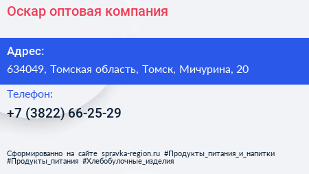 Оскар, оптовая компания по адресу 634049, Томская область, Томск, Мичурина, 20 в дальнейшем Организация, размещена в следующих категориях: