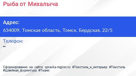 Рыба от Михалыча по адресу 634009, Томская область, Томск, Бердская, 22/5 в дальнейшем Организация, размещена в следующих категориях: