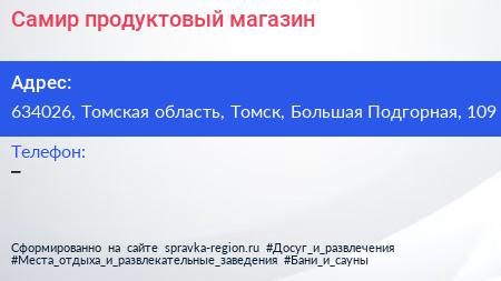 Самир, продуктовый магазин по адресу 634026, Томская область, Томск, Большая Подгорная, 109 в дальнейшем Организация, размещена в следующих категориях: