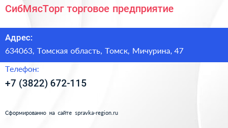 СибМясТорг, торговое предприятие по адресу 634063, Томская область, Томск, Мичурина, 47 в дальнейшем Организация, размещена в следующих категориях: