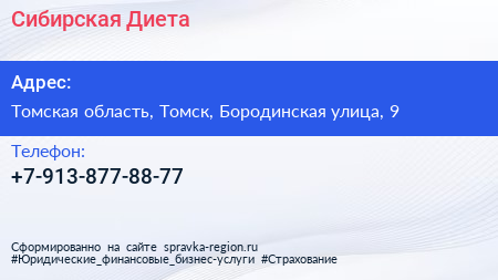 Сибирская Диета по адресу Томская область, Томск, Бородинская улица, 9 в дальнейшем Организация, размещена в следующих категориях: