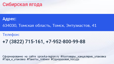 Сибирская ягода по адресу 634030, Томская область, Томск, Энтузиастов, 41 в дальнейшем Организация, размещена в следующих категориях: