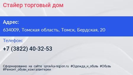 Стайер, торговый дом по адресу 634009, Томская область, Томск, Бердская, 20 в дальнейшем Организация, размещена в следующих категориях: