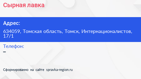 Сырная лавка по адресу 634059, Томская область, Томск, Интернационалистов, 17/1 в дальнейшем Организация, размещена в следующих категориях: