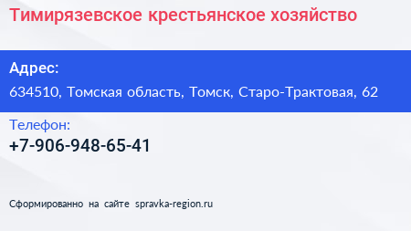 Тимирязевское, крестьянское хозяйство по адресу 634510, Томская область, Томск, Старо-Трактовая, 62 в дальнейшем Организация, размещена в следующих категориях: