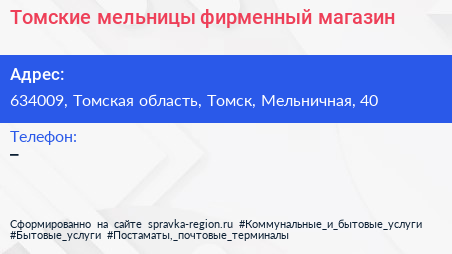 Томские мельницы, фирменный магазин по адресу 634009, Томская область, Томск, Мельничная, 40 в дальнейшем Организация, размещена в следующих категориях: