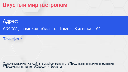 Вкусный мир, гастроном по адресу 634061, Томская область, Томск, Киевская, 61 в дальнейшем Организация, размещена в следующих категориях: