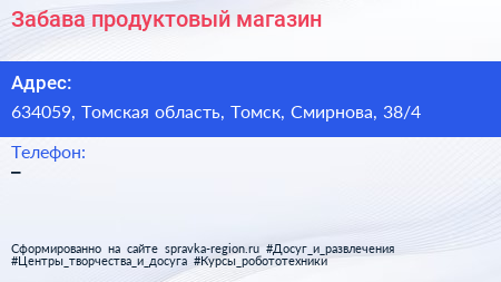 Забава, продуктовый магазин по адресу 634059, Томская область, Томск, Смирнова, 38/4 в дальнейшем Организация, размещена в следующих категориях: